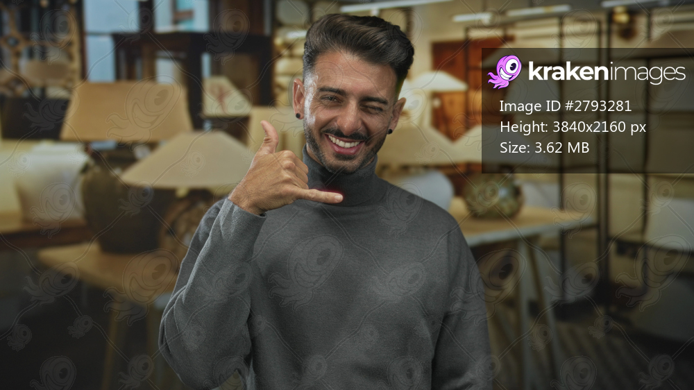 Man shows call gesture with finger to ear among beige lamps in modern building; welcoming communication.