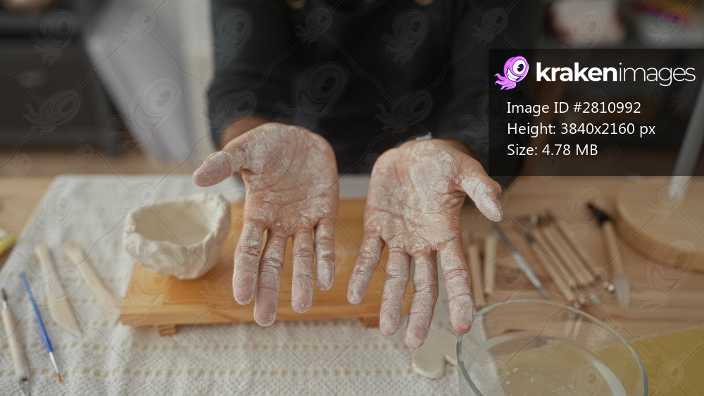 Man shows clay covered hands over wooden worktable in studio during pottery making; craftsmanship creativity patience skill.