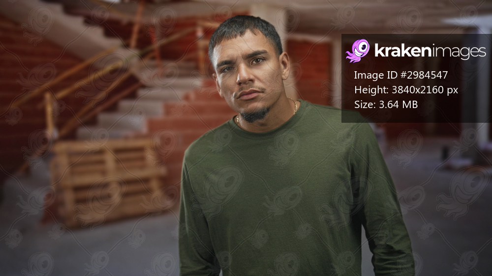 Man shows exposed face tilting head, wearing green shirt and necklace in unfinished building with staircase and wooden pallet; determination resilience. - Kraken Images