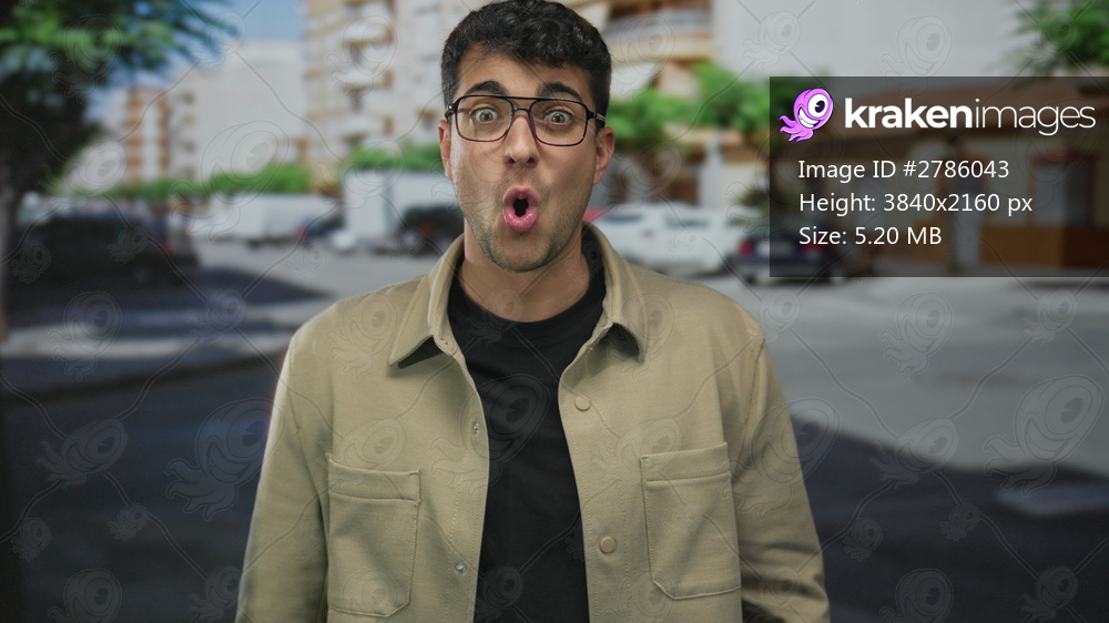 Man shows face in candid smile on street where guy hispanic and young stands in urban outdoor scene with casual attire.