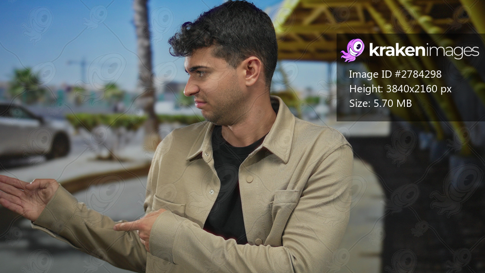 Man shows hand while pointing along street next to young hispanic performer holding palm in an outdoor setting with a confused but casual posture.