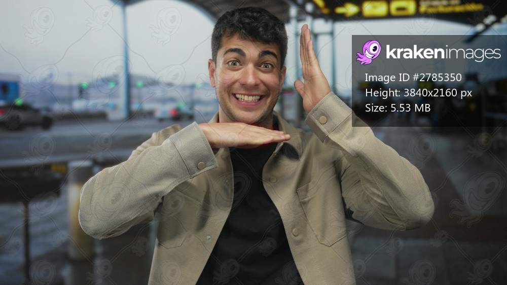 Man shows hands framing camera in airport lounge while guy lifts palm gesture near terminal desk for travel check as hispanic passenger.