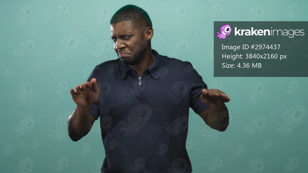 Man shows hands out palms forward pushing gesture in studio wearing navy polo and zipper collar; hesitation disgust.