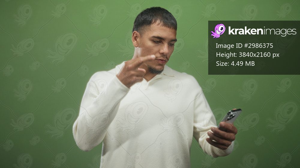 Man shows middle finger with left hand while checking smartphone and scrolling messages in studio; anger defiance.