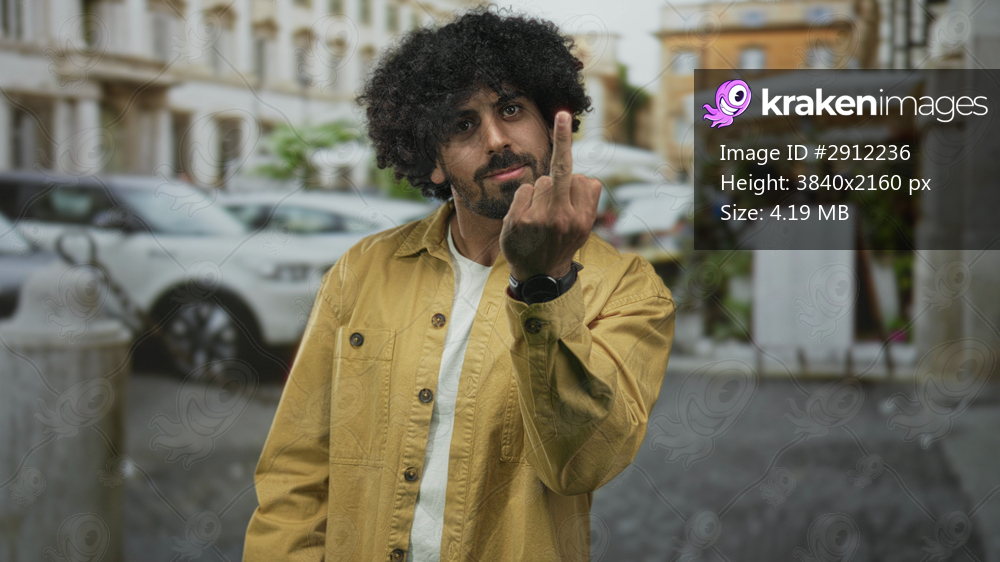 Man shows middle finger with raised hand toward camera on street among parked cars and cafe storefronts; defiance rebellion.