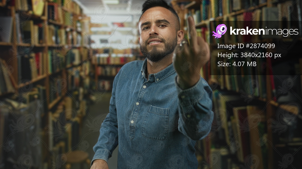 Man shows middle finger toward camera in a library building aisle lined with books and shelves; defiance protest.