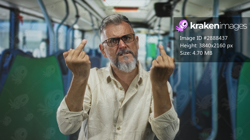Man shows middle fingers on bus aisle, leaning forward with clenched jaw and raised arms; anger defiance.