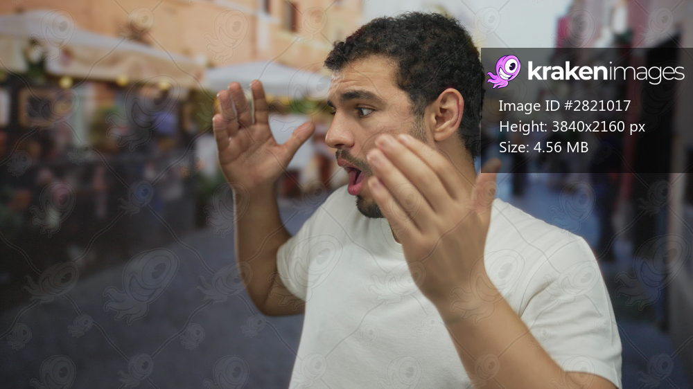 Man shows open palm gesture on a busy urban street lined with shops and blurred pedestrians; confusion.