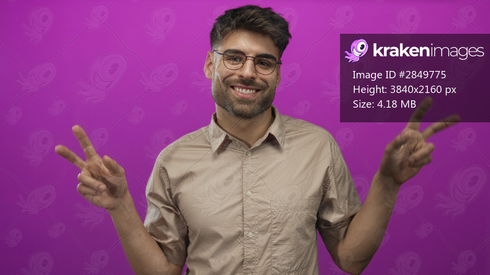 Man shows peace sign with both hands in purple studio setting wearing glasses and beige shirt; victory joy.