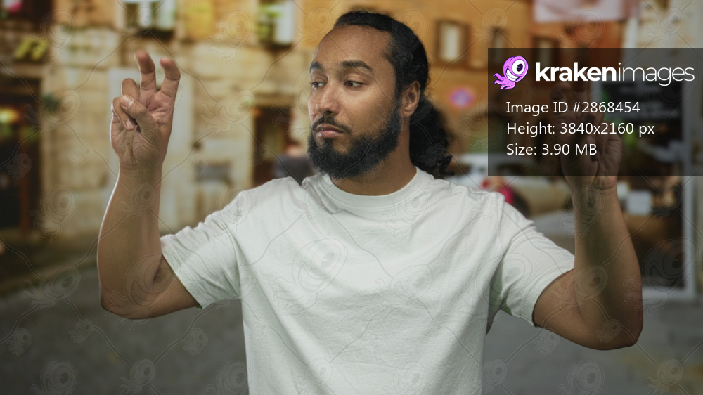 Man shows peace sign with both hands, wearing white t shirt, standing in a cobblestone street with blurred buildings; peaceful calm.