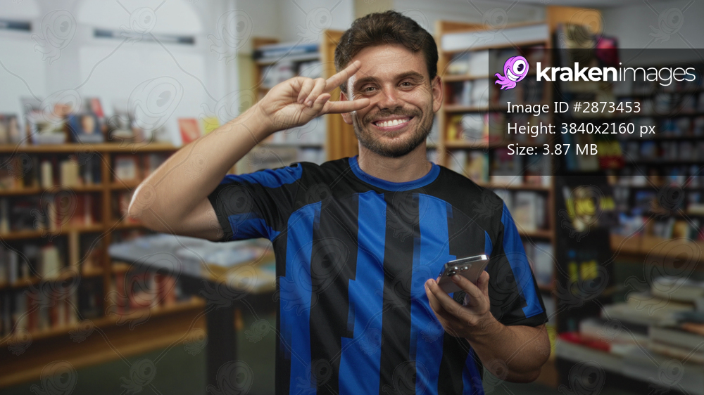 Man shows peace sign over eye with hand while holding smartphone in library building, smiling at camera and posing casually; playful happiness.