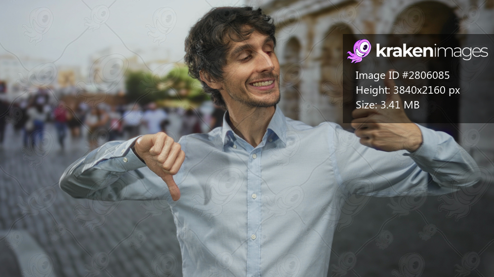 Man shows thumb up and thumb down gesture on cobblestone street outside roman coliseum outdoors; ambivalence.