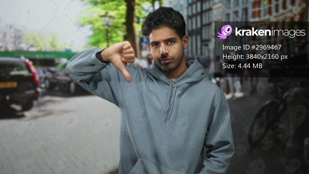 Man shows thumbs down gesture with visible thumb and hand on an urban street in a hoodie, standing near cars and a bicycle; disapproval.