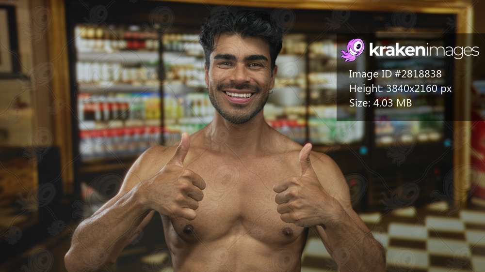 Man shows thumbs up with bare chest in building restaurant aisle filled with coolers and shelves; confidence.