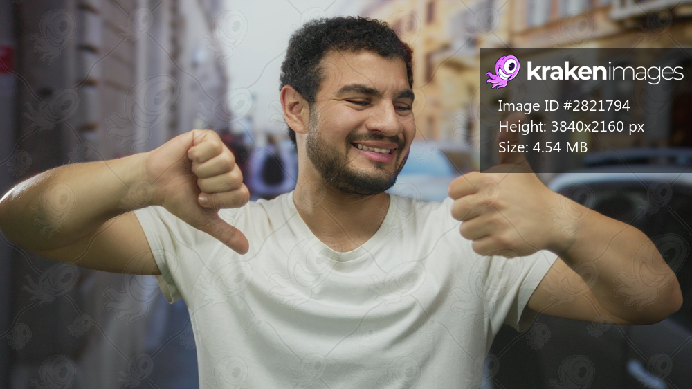 Man shows thumbs up with one hand and thumbs down with the other on a sunlit busy city street; uncertainty.