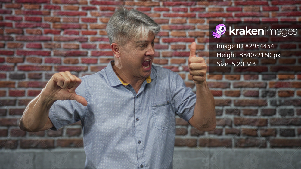 Man shows thumbs up and thumbs down with hands and expressive face in studio against brick wall; ambivalence choice conflict.
