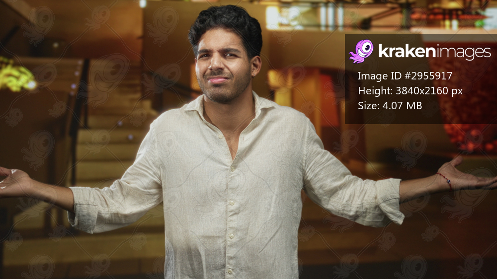 Man shrugging with arms out and palms visible, wearing linen shirt, standing before a staircase and decorative planter in building; uncertainty.