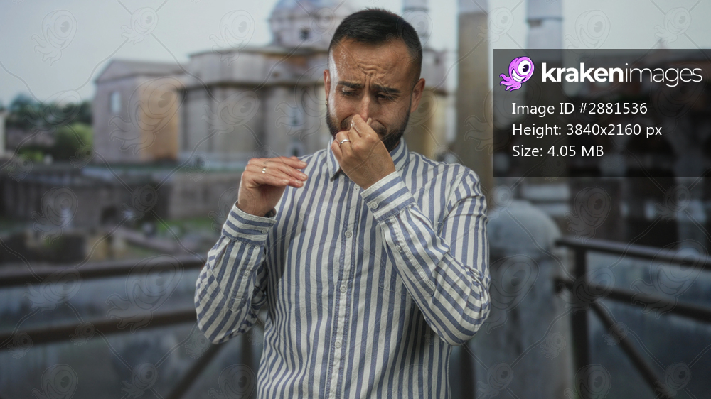 Man shrugging hands palms up on building balcony railing wearing striped shirt and beard, showing puzzled gesture; confusion uncertainty.