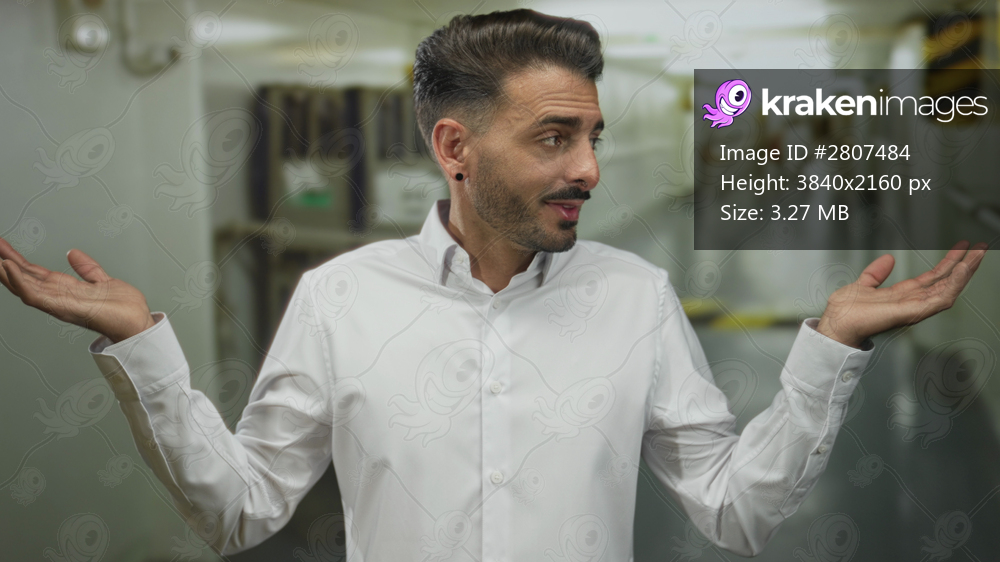 Man shrugging palms up in building wearing white shirt with puzzled expression; confusion uncertainty.