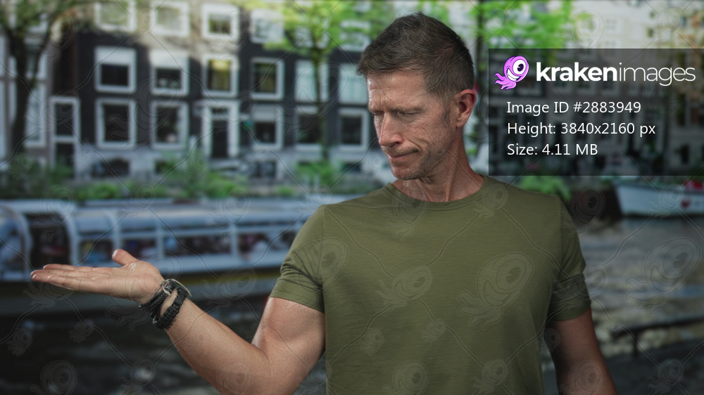 Man shrugging with palms up on an amsterdam street beside a canal boat and narrow building facades; uncertainty dilemma.