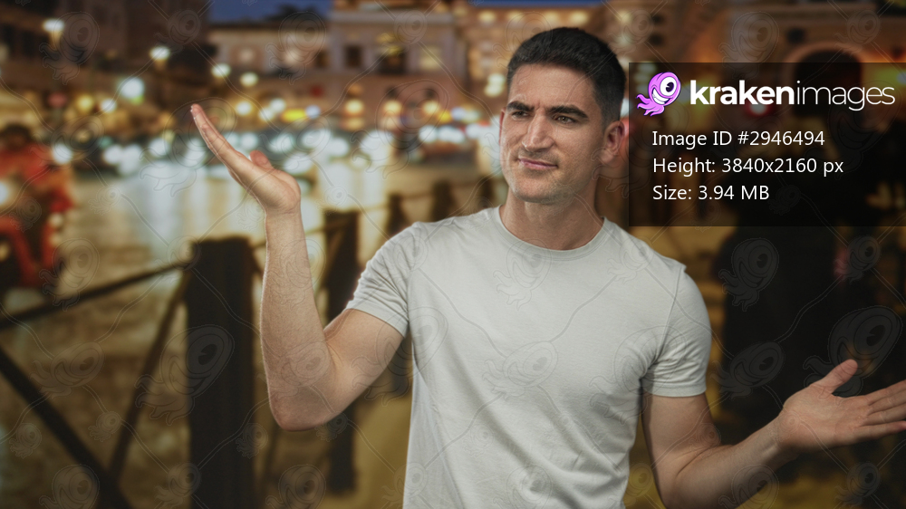 Man shrugging with palms up on illuminated city street at night facing blurred traffic lights; confusion.