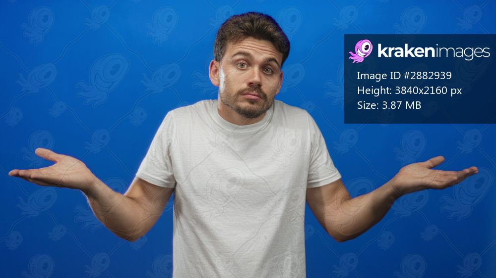 Man shrugging with palms up and open hands in blue studio wearing a white t shirt and facing camera; uncertainty doubt.