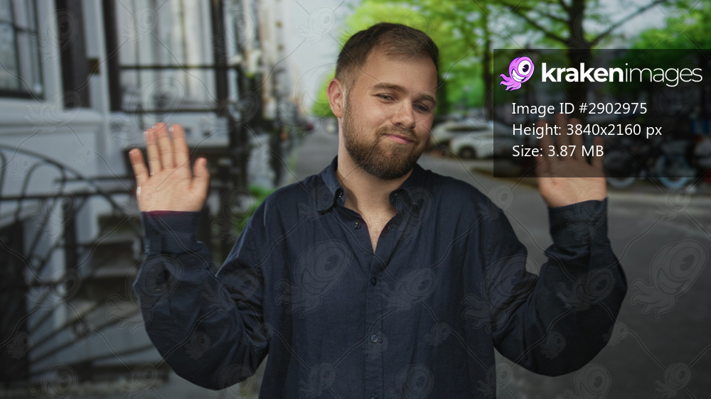 Man shrugging with palms up and tilted head on a cobblestone city street, wearing navy button shirt and beard; nonchalant acceptance.