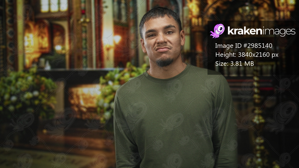 Man shrugs shoulder with pursed lips beside altar in ornate church building, wearing green shirt; quiet reflective uncertainty.