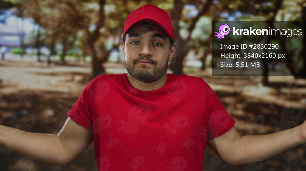 Man shrugs shoulders in sunny green park wearing bright red cap and t shirt with arms outstretched; uncertainty doubt confusion indecision.