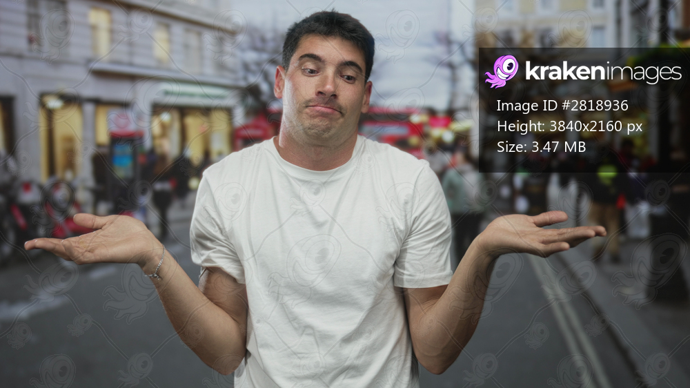 Man shrugs shoulders on busy urban street lined with shops and parked bicycles under overcast sky; uncertainty.