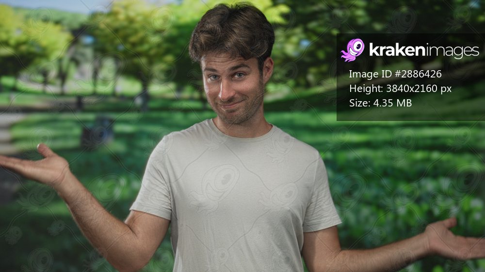 Man shrugs shoulders with palms up and arms outstretched in a forest setting, casual t shirt visible; uncertainty playful doubt.