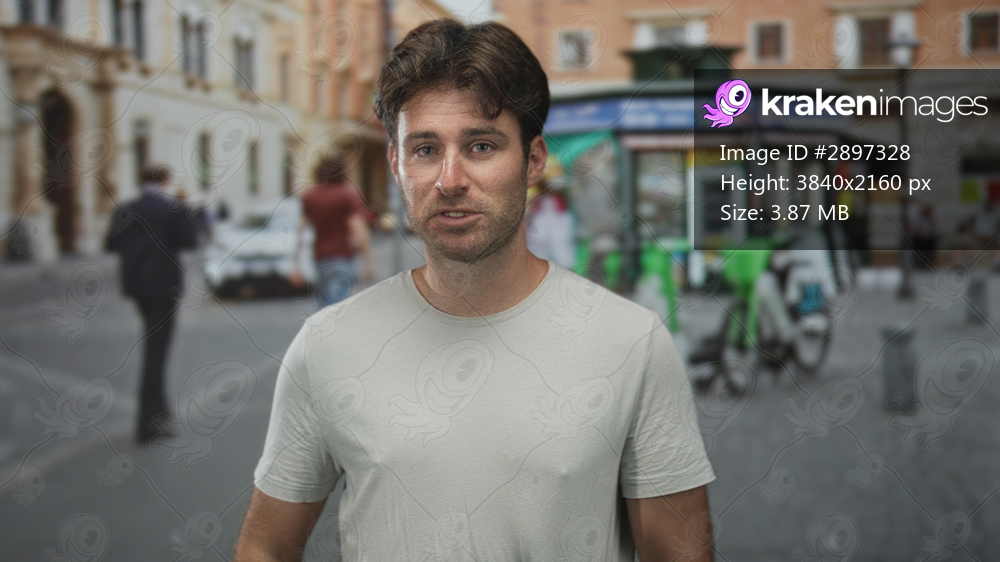 Man shrugs shoulders and purses lips on a busy city street near a kiosk and parked bicycle; bemusement.