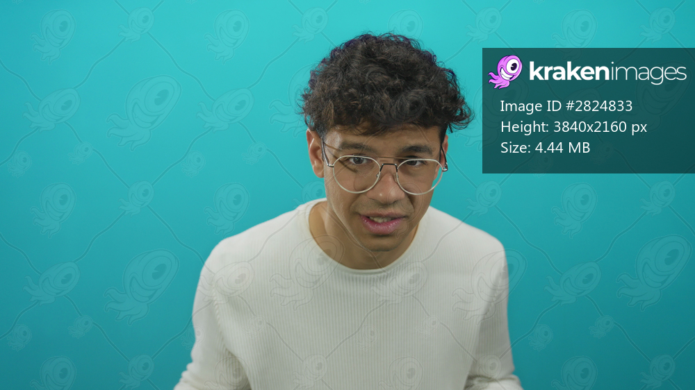 Man shrugs shoulders with raised hands wearing round glasses and a white sweater in turquoise studio; uncertainty.