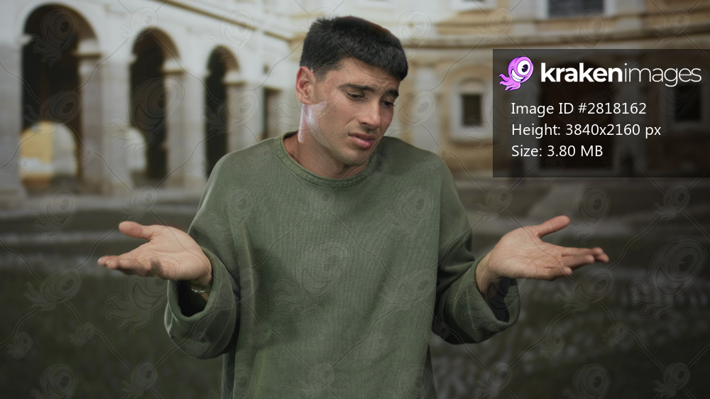 Man shrugs shoulders and spreads bare hands near building entrance walkway paving stones; uncertainty.