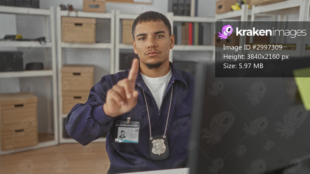 Man sits at desk and points finger at camera showing police badge and id card by computer in office building; authority vigilance.