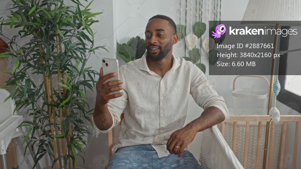 Man sitting holding smartphone beside baby crib inside a building room looking at screen; fatherhood bonding affection.