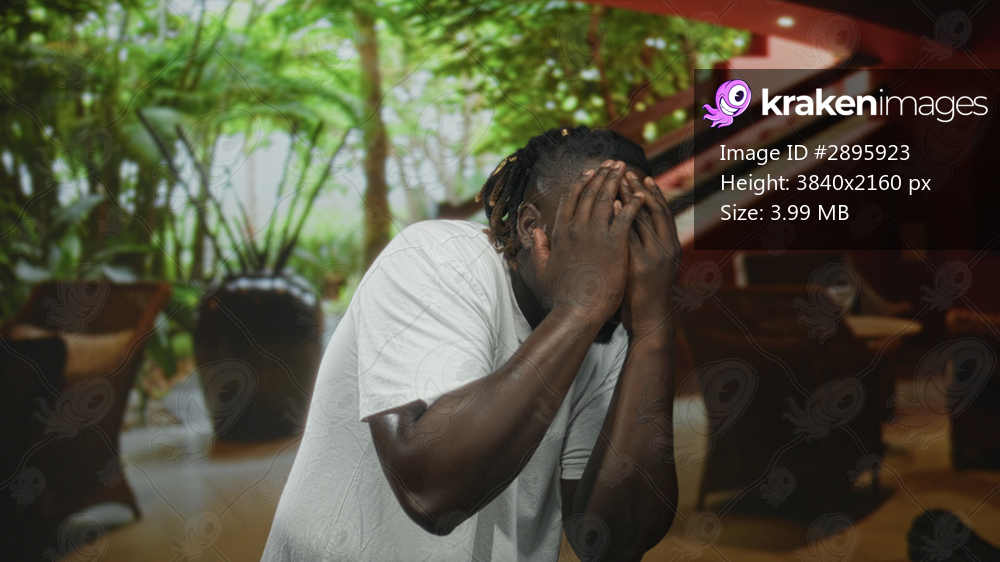 Man sitting hunched, covering face with hands in hotel building lobby among wicker chairs and large potted plants, white t shirt visible; isolation sadness. - Kraken Images