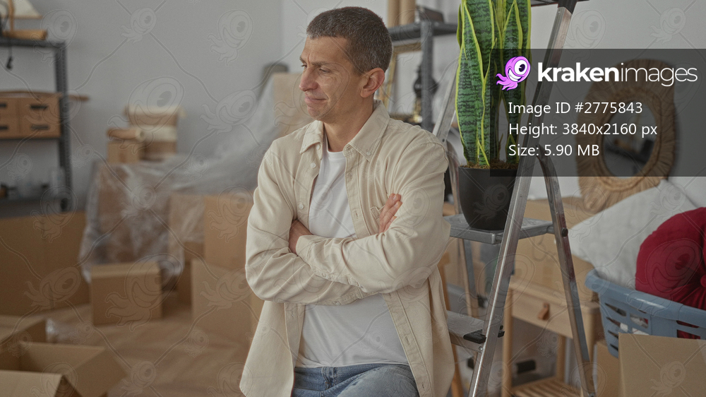 Man sitting in a living room surrounded by moving boxes and a ladder, reflecting the process of settling into a new home, exuding a sense of contemplation and transition. - Kraken Images