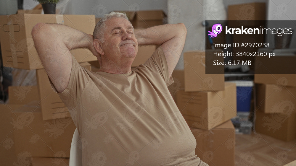 Man sitting on chair resting with hands behind head among stacked moving boxes in building interior, wearing beige tshirt and closed eyes; relief rest quiet. - Kraken Images