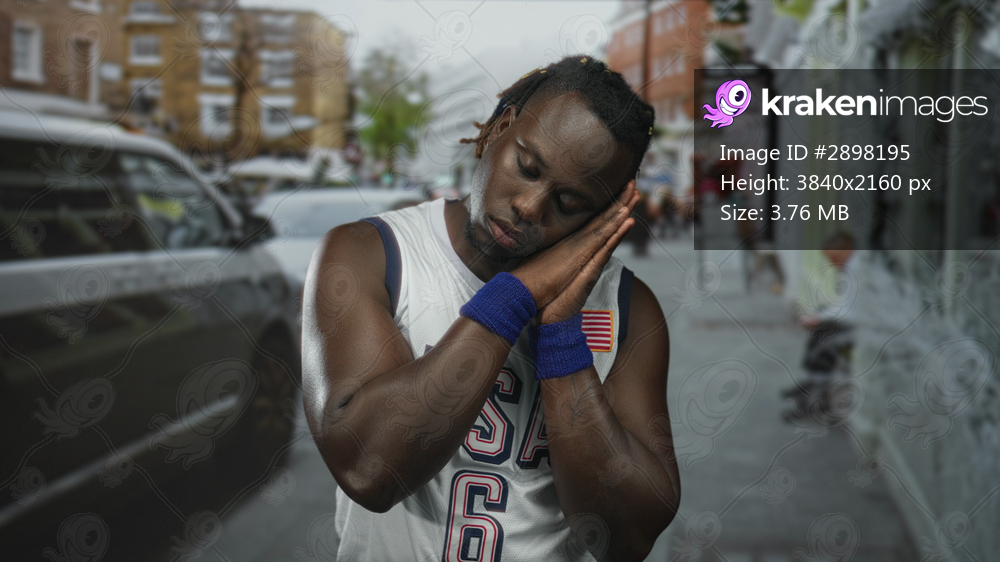 Man sleeping with hands pressed to cheek on busy city street wearing usa basketball jersey and blue wristbands, head tilted and eyes closed; rest.