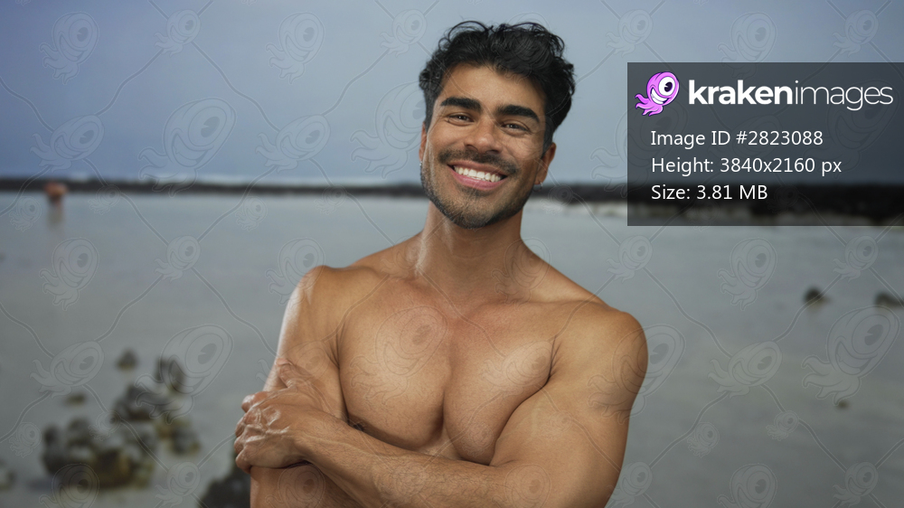 Man smiles as he crosses muscular arms over strong chest while standing on rocky beach shore under cloudy sky; confidence.