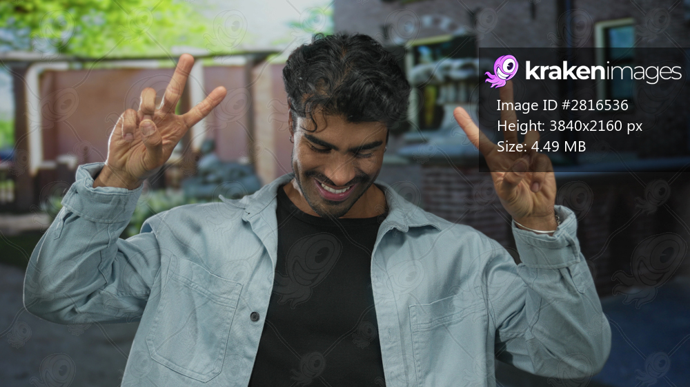 Man smiles broadly and clenches fists on sunlit city street corner before a brick building facade; excitement triumph.