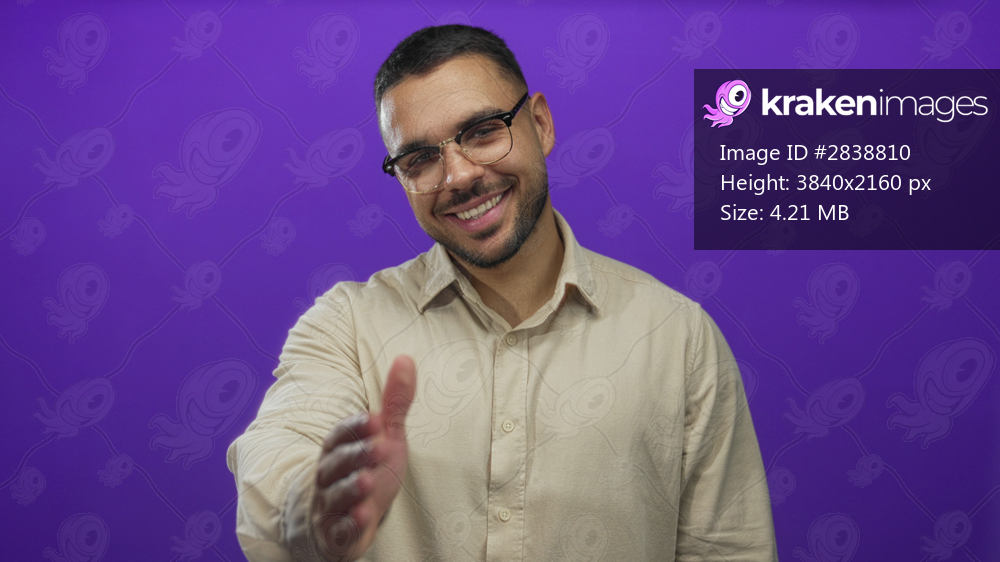 Man smiles and extends hand for a warm handshake in studio with vivid purple hue; greeting friendliness.