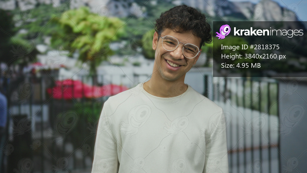 Man smiles with eyeglasses and visible teeth on street in front of stone building under sunlight; happiness.