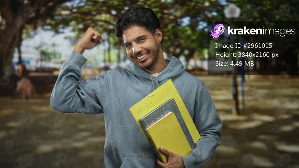 Man smiles and flexes his arm while holding yellow notebooks and a folder, wearing a grey hoodie on a tree lined street; confidence achievement.