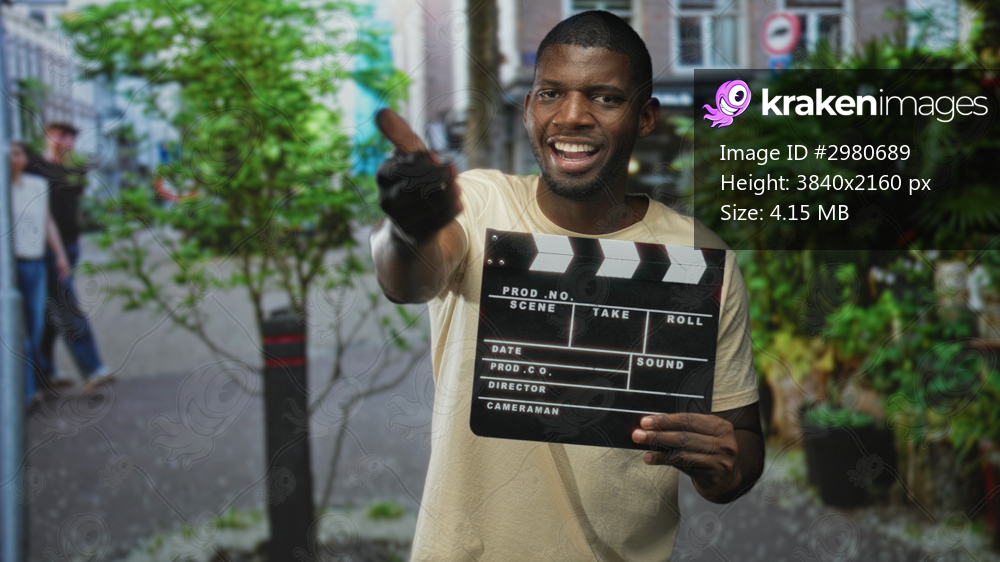 Man smiles, holds clapperboard with one hand and points toward camera with the other on a street lined with plants and shopfronts; joy creativity inspiration. - Kraken Images