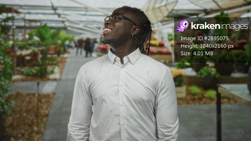 Man smiles and looks up at colorful flowers in a street market, face turned and hands relaxed, wearing white shirt; joy community.
