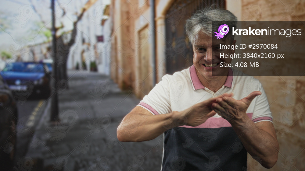 Man smiles and makes a fingertip money gesture with his right hand near chest while wearing a polo shirt on a narrow urban street beside a stone building; playful amusement. - Kraken Images
