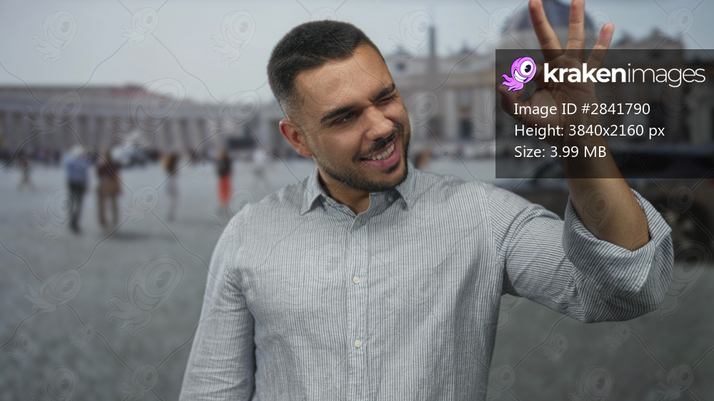 Man smiles and makes ok sign with hand in building square before vatican dome and facade under bright sunlight; optimism.