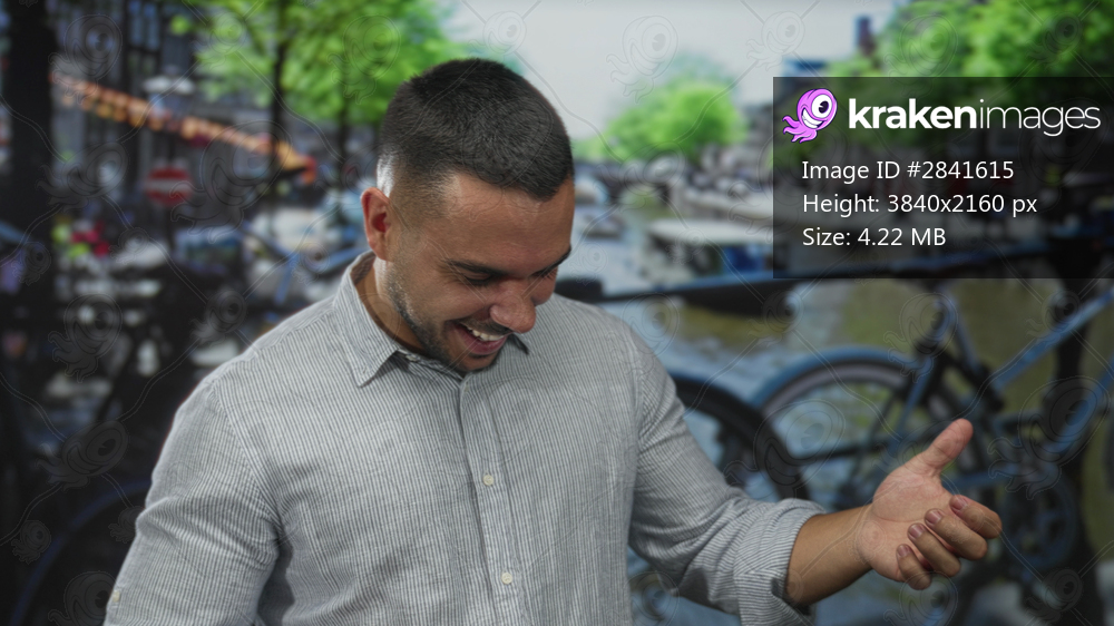 Man smiles with open palm gesture beside a canal in a city street setting with parked bicycles and passing boats; travel exploration leisure joy.